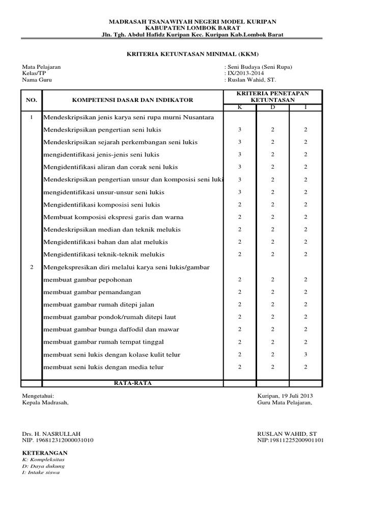 Kkm Seni Budaya Kelas 7 Smp from imgv2-2-f.scribdassets.com Dokumen perangkat pembelajaran k13 terpadu seni budaya kelas vii revisi terbaru 2020 terintegrasi ppk, literasi, 4c, hots dan model pembelajaran abad 21 yang terdiri :rpp, silabus, pemetaan kd, kkm,ki kd, kalender pendidikan, rincian pekan efektif. Semoga bisa membantu dan bermanfaat untuk anda baik untuk sekarang maupun masa yang akan datang. Demikianlah perangkat pembelajaran kkm seni budaya untuk kelas 7 yang dapat saya share pada kesempatan kali ini semoga apa yang telah saya bagikan ini dapat bermanfaat buat bapak dan ibu guru yang sedang mencari perangkat kkm seni budaya kelas vii smp kurikulum 2013. Demikianlah informasi tentang pendidikan mengenai bagian dari komponen perangkat pembelajaran seni budaya untuk kkm admin sajikan. Feb 04, 2016 · demikianlah berbagi file tentang rpp, silabus, prota, prosem, kkm, sk&kd, smp kurikulum 2013 kelas 7, 8 , 9 semua mata pelajaran. Download & view kkm seni budaya kelas 7 smp as pdf for free. Download kkm k13 kelas 7 bahasa indonesia revisi terbaru. Kriteria paling rendah untuk menyatakan siswa mencapai kentuntasan dinamakan kriteria ketuntasan minimal (kkm).